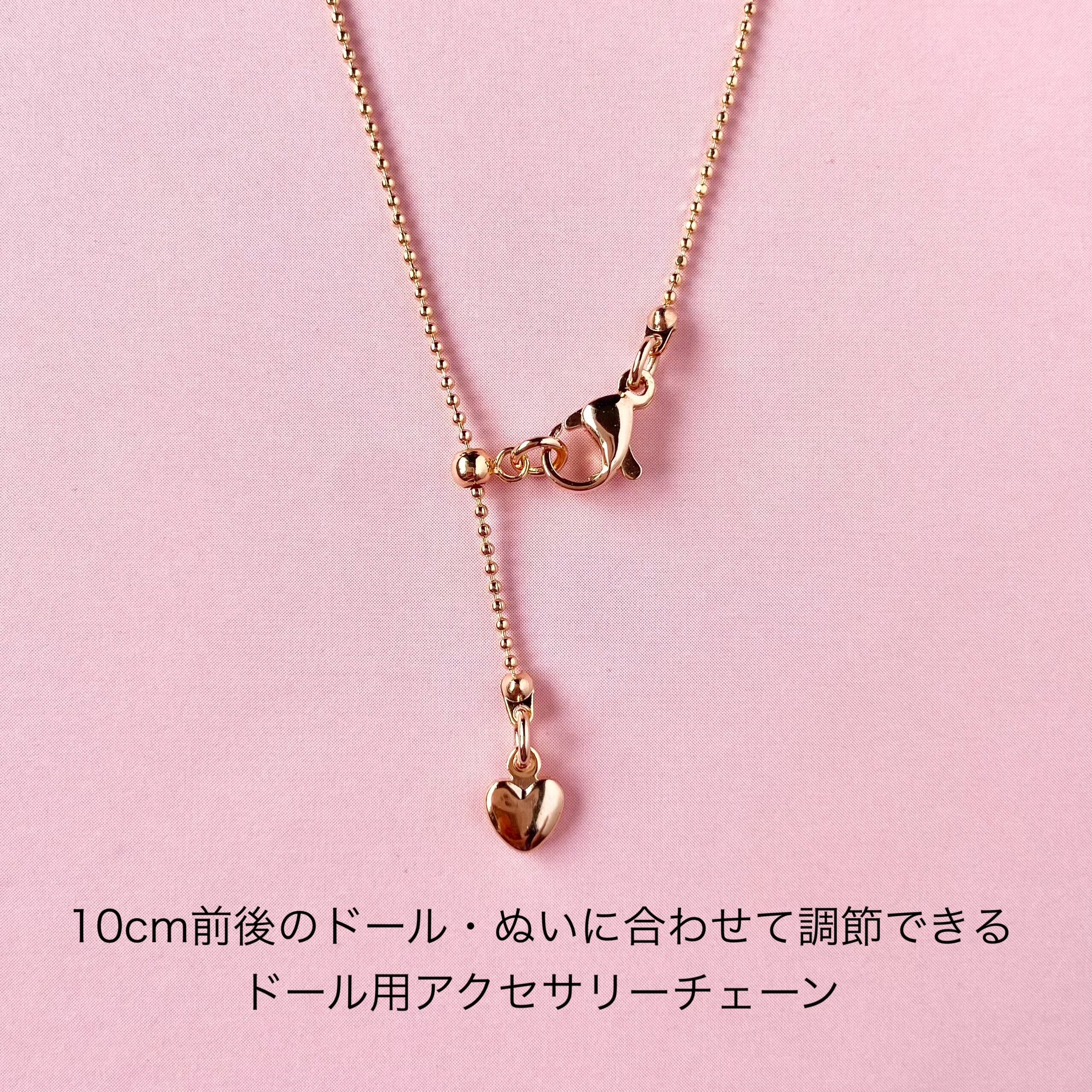 10cm台でも胴体の厚みによってはご着用いただけない場合がございますので、下に記載しているチェーンの長さとお手元のドール・ぬいのご着用したい長さを測ってのご購入をお勧めいたします。
