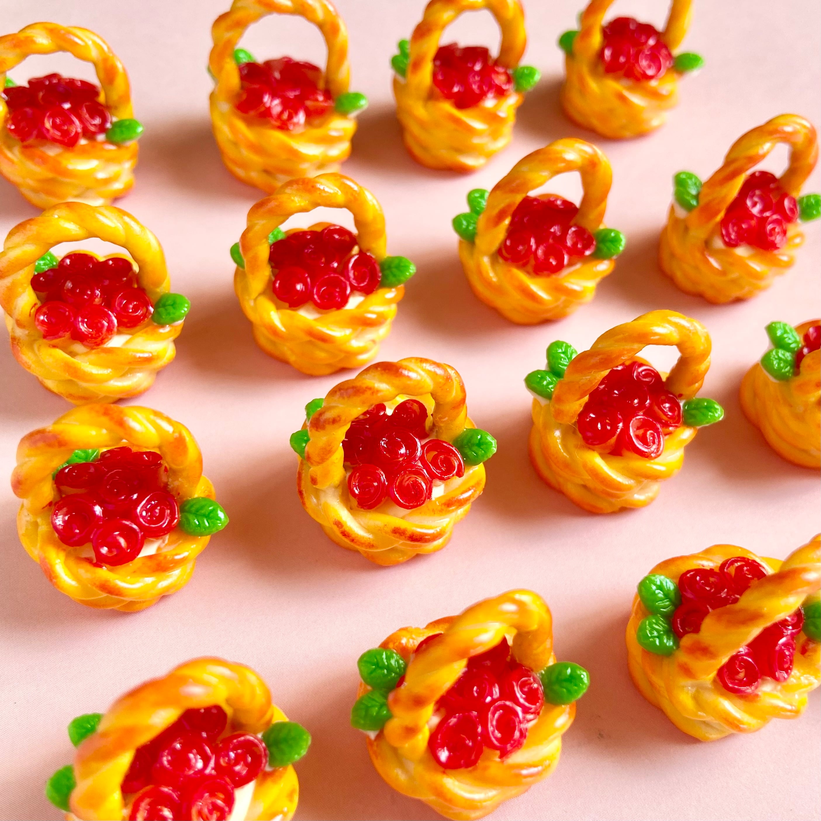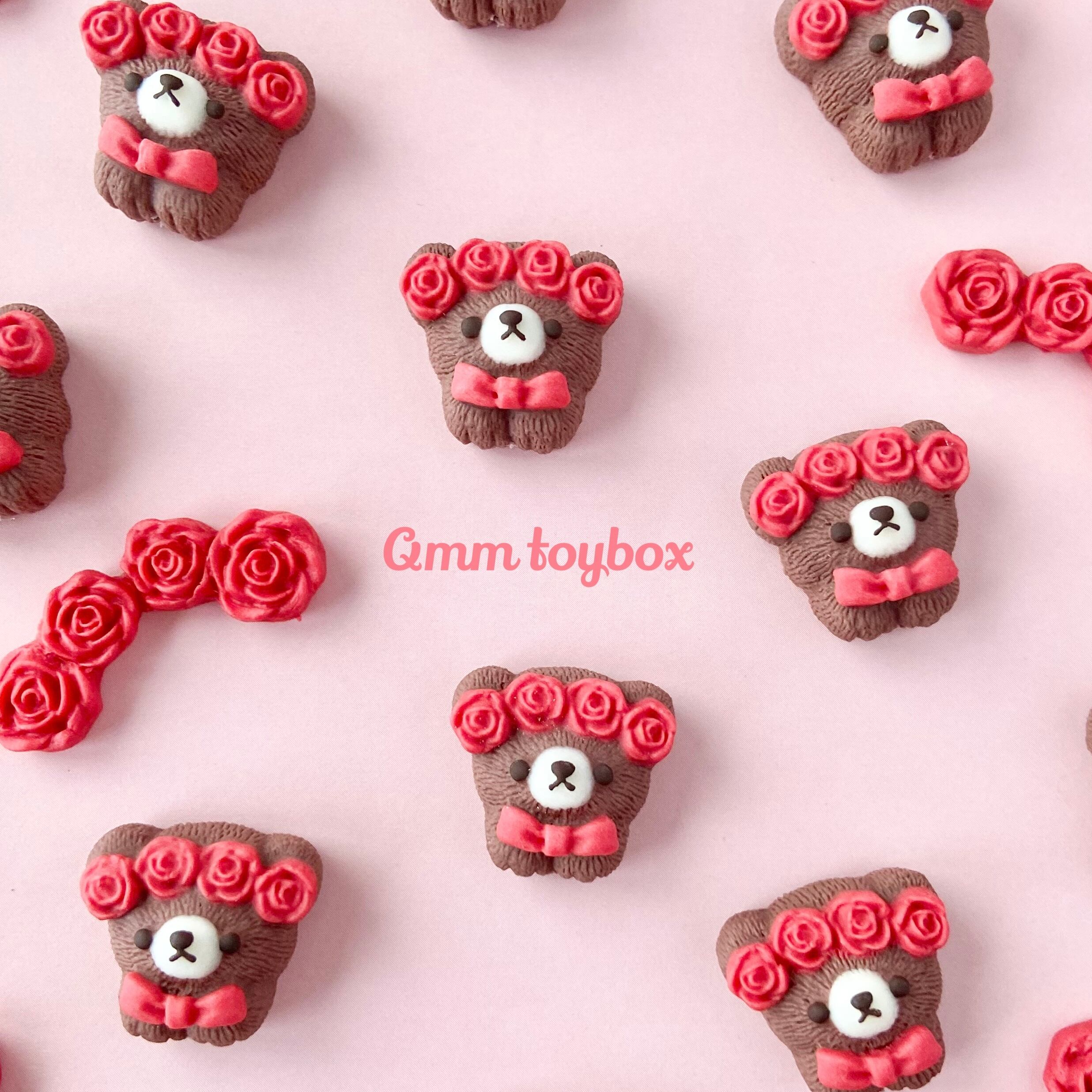 薔薇のヘッドドレスでおめかししたくまさんが林檎で出来た薔薇の花束籠を持ってお出かけする、ロマンチックで乙女チックなフェイクスイーツアクセサリーです