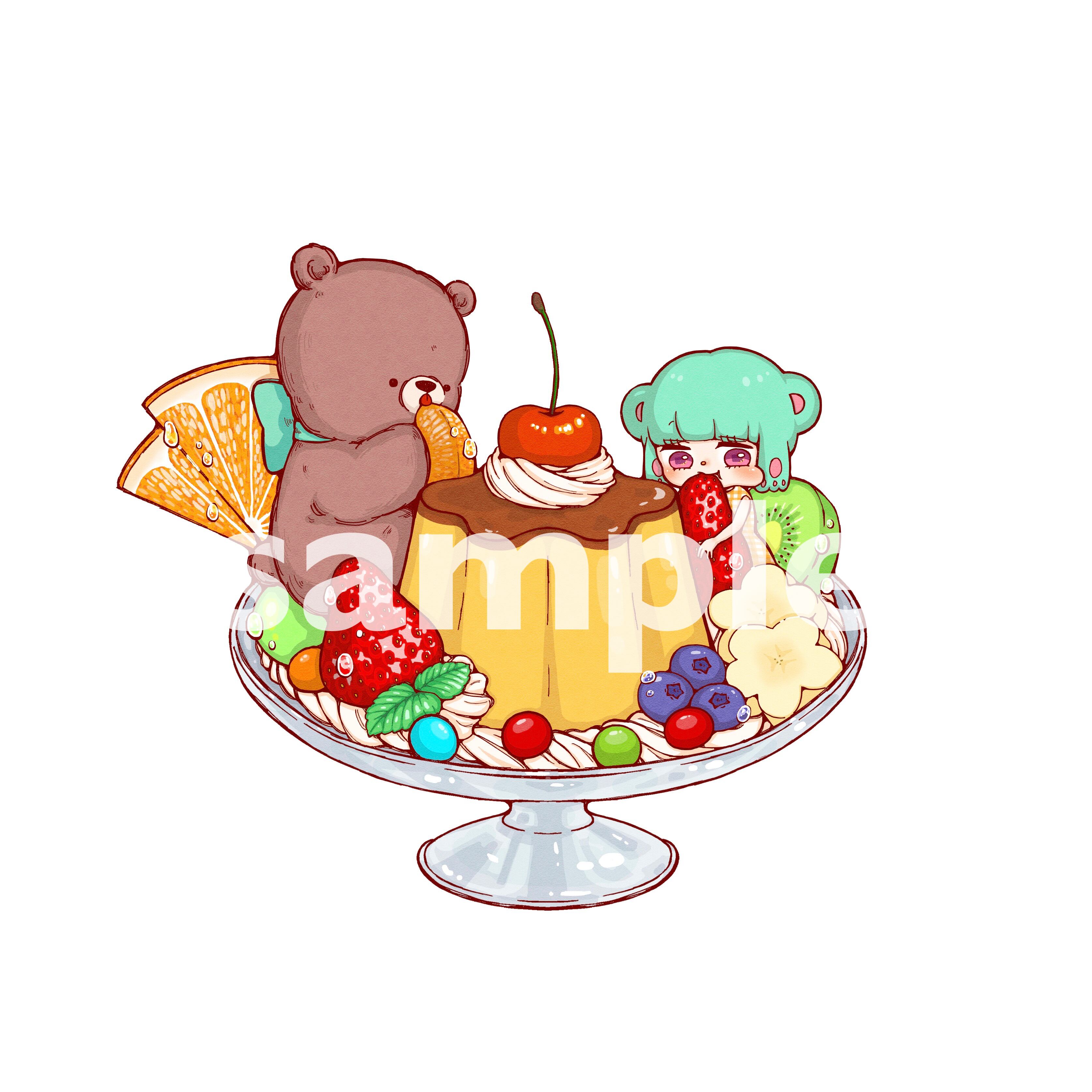 女の子『ミニ』とくまの『ビスコッティさん』がプリンのテーブルにつき、カラフルなフルーツを堪能しているプリンアラモードのイラストです